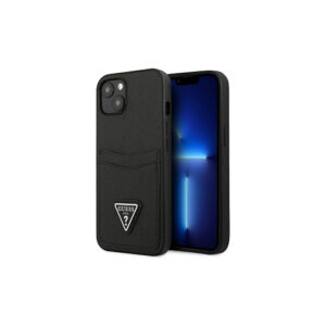 iPhone 13 ümbris Guess Saffiano Triangle kaarditaskuga GUHCP13MPSATPK must